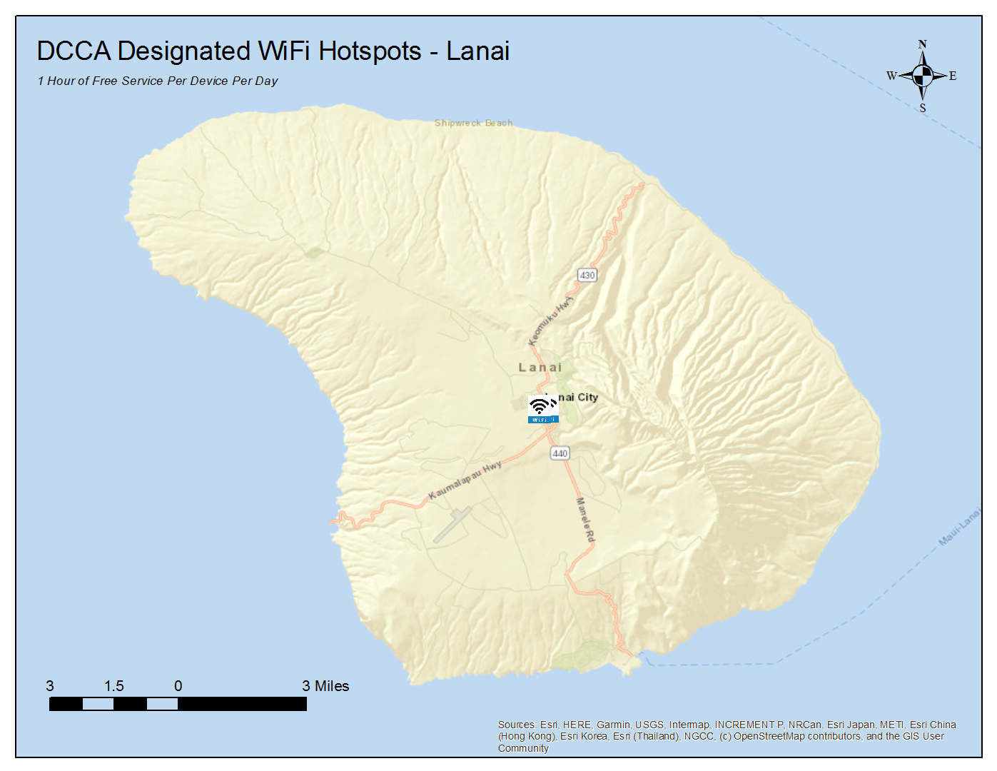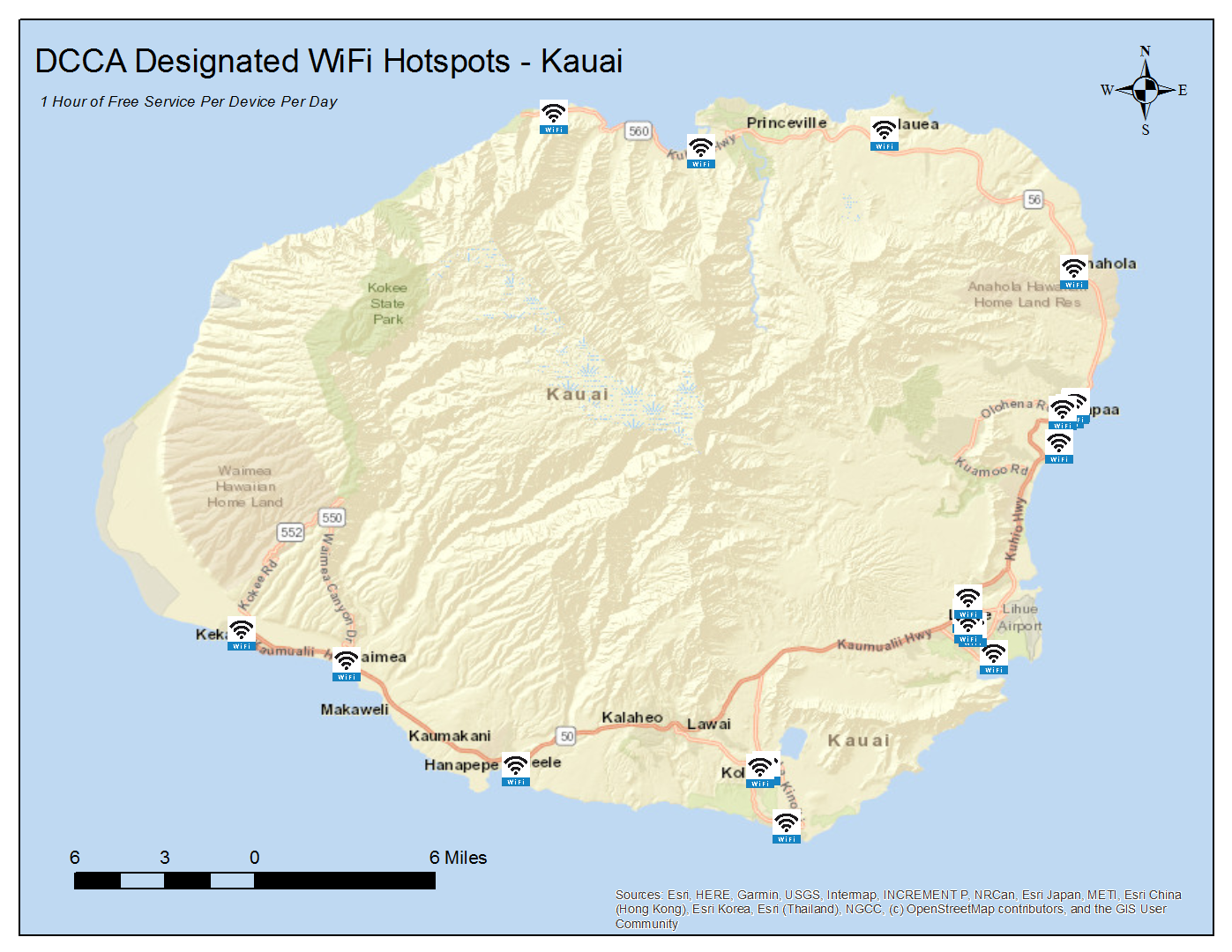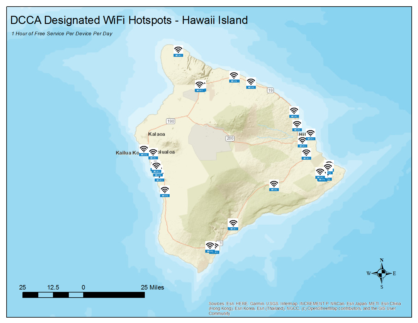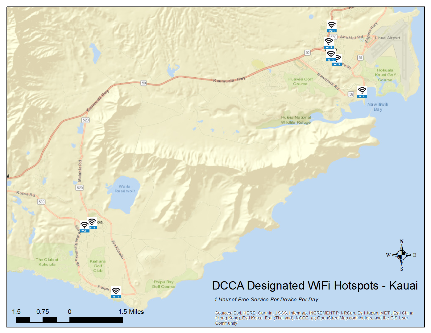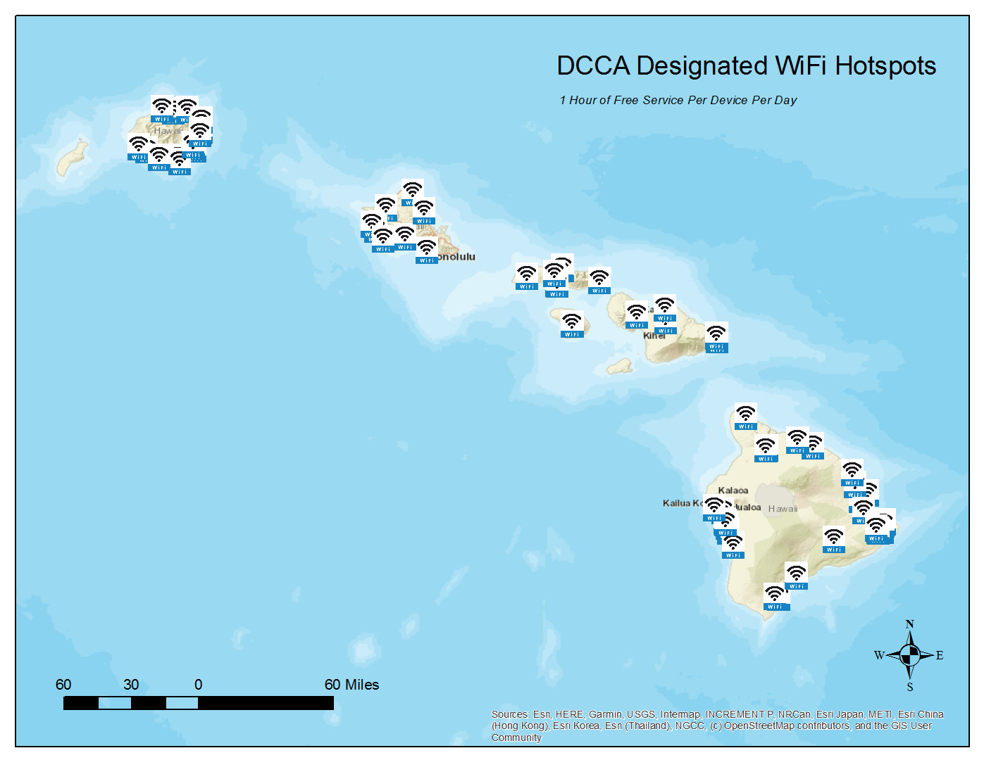 These designated locations offer 1 hour of free WiFi service per device per day. To locate these hotspots, scroll down for listings and maps by island or click on the link below to access an interactive version of the state map (locations are approximate):