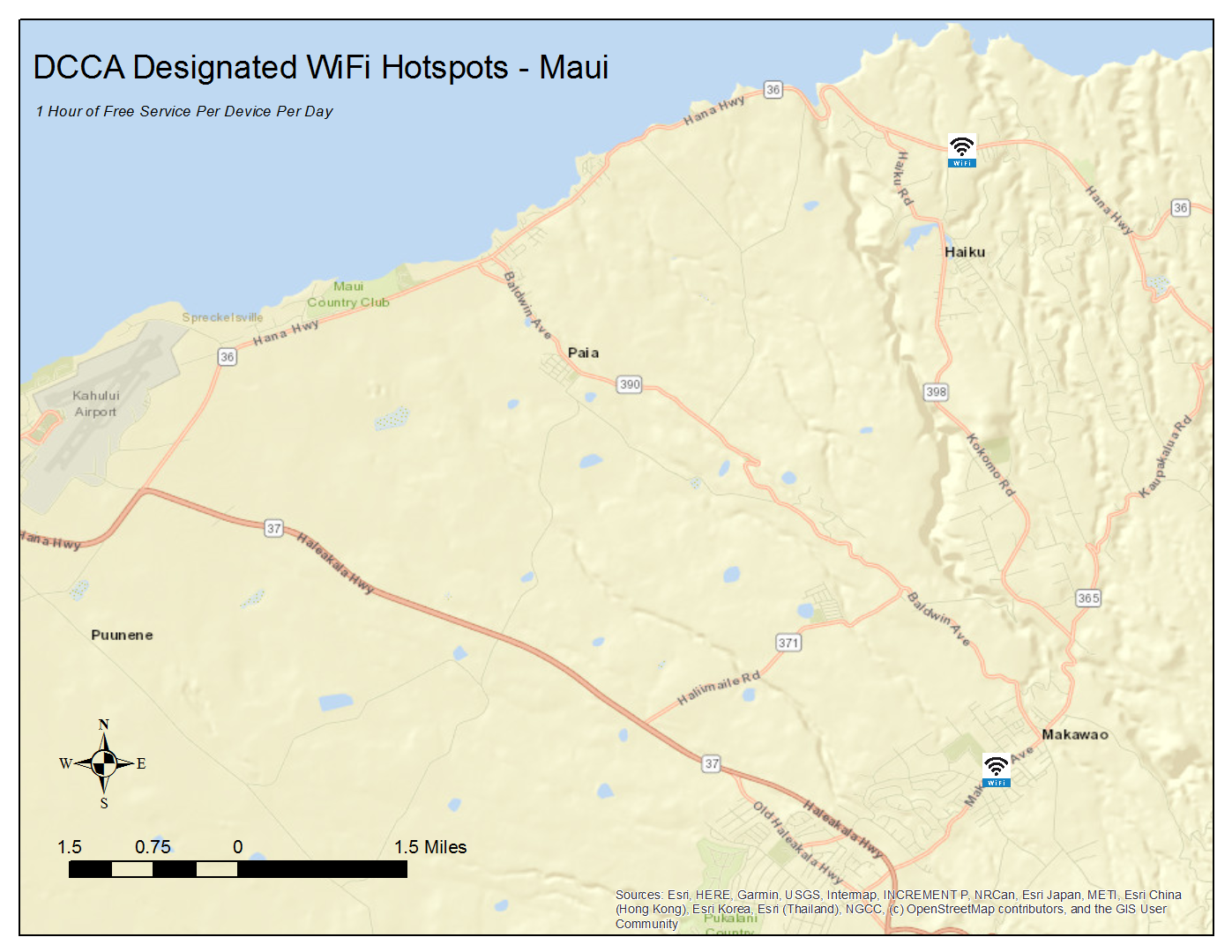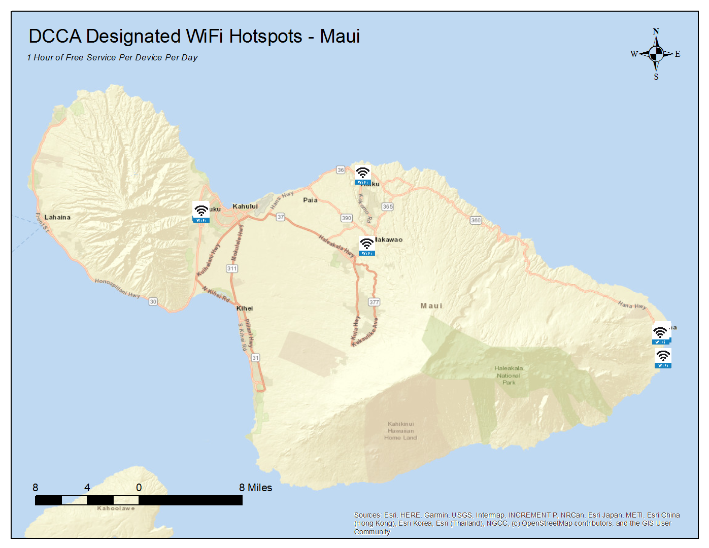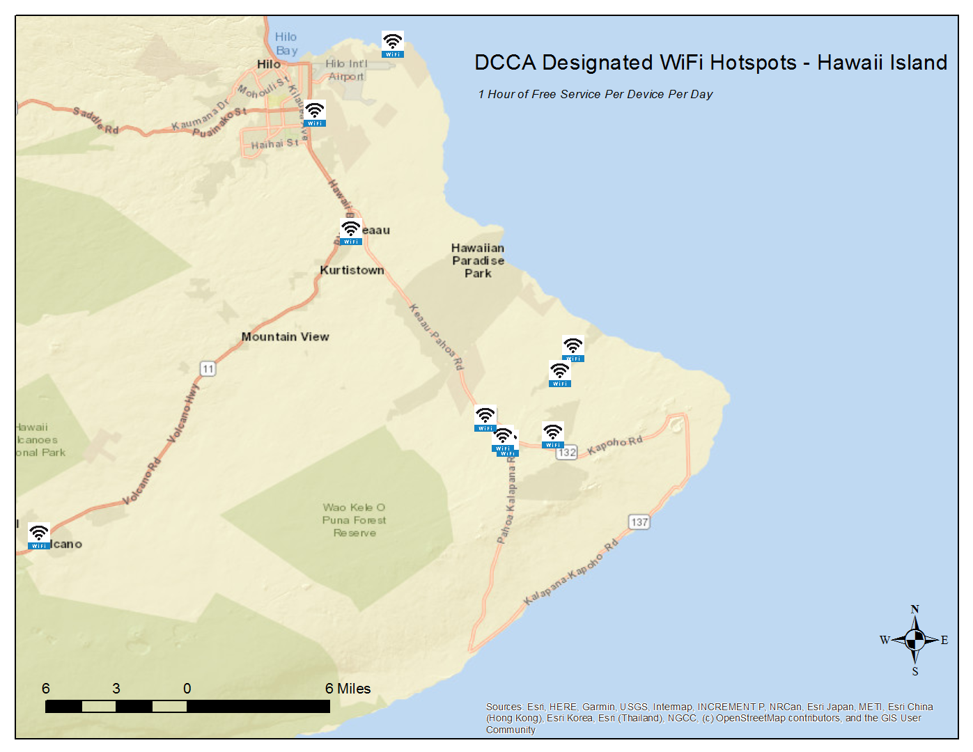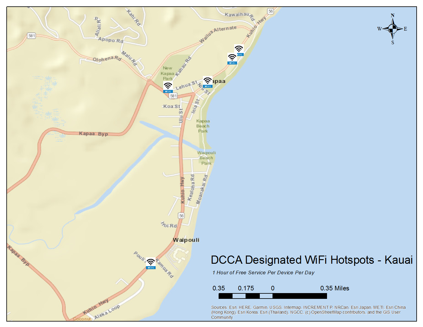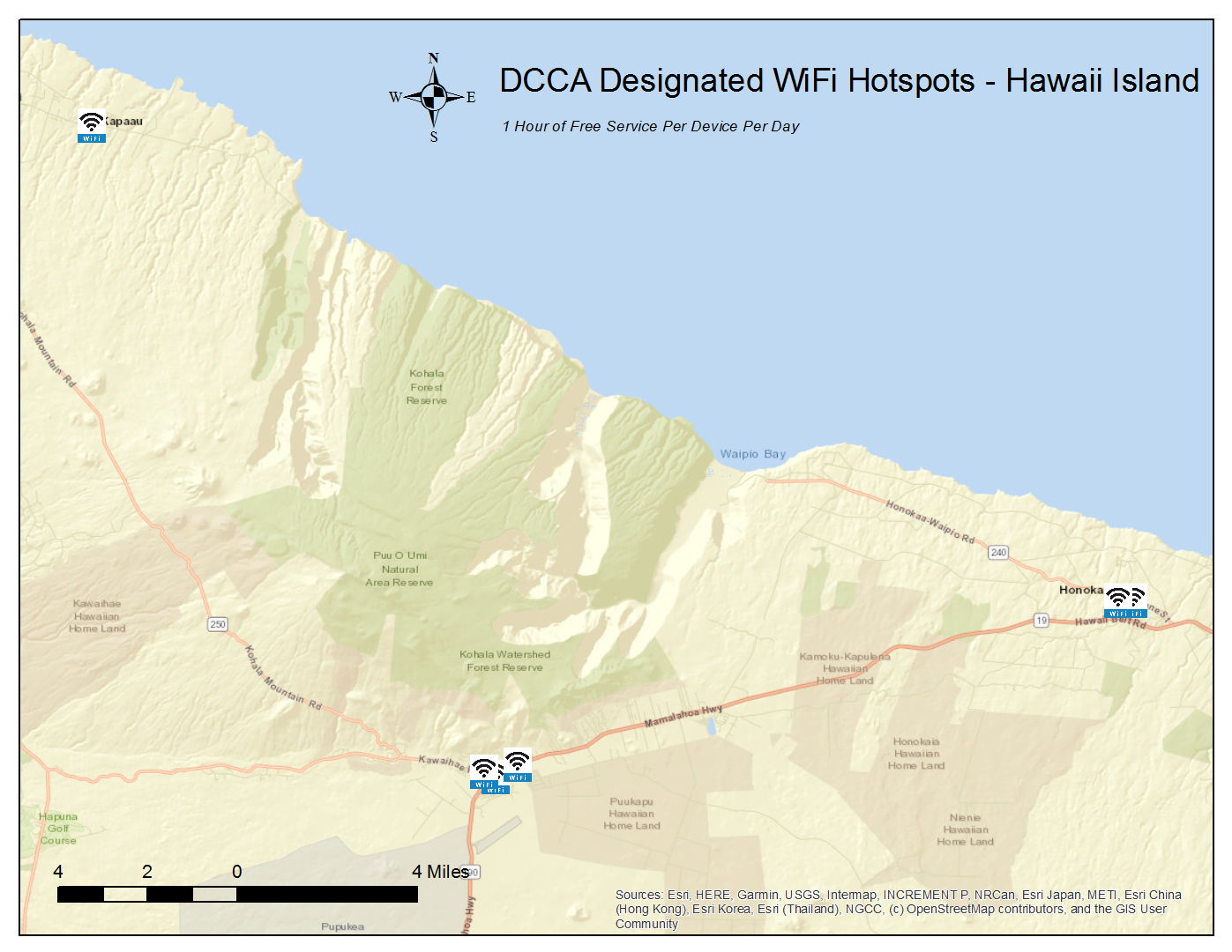 These designated locations offer 1 hour of free WiFi service per device per day. To locate these hotspots, scroll down for listings and maps by island or click on the link below to access an interactive version of the state map (locations are approximate):