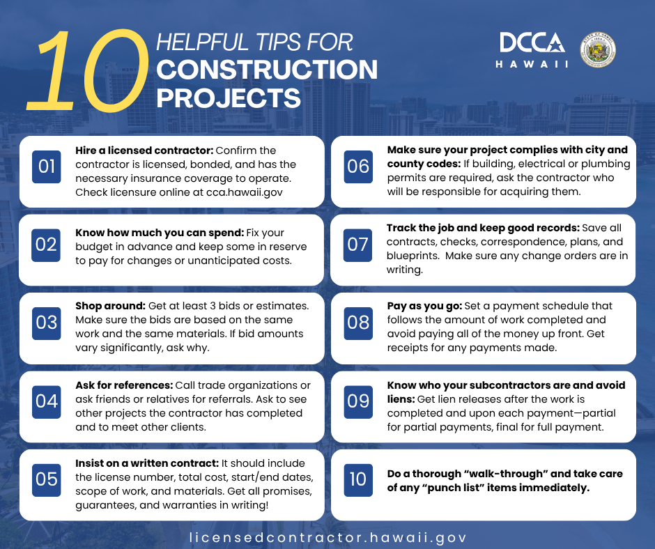 The Department of Commerce and Consumer Affairs emphasizes you take the time to do your research and hire a licensed contractor. Please review the information below to learn more about the importance of licensed contractors.