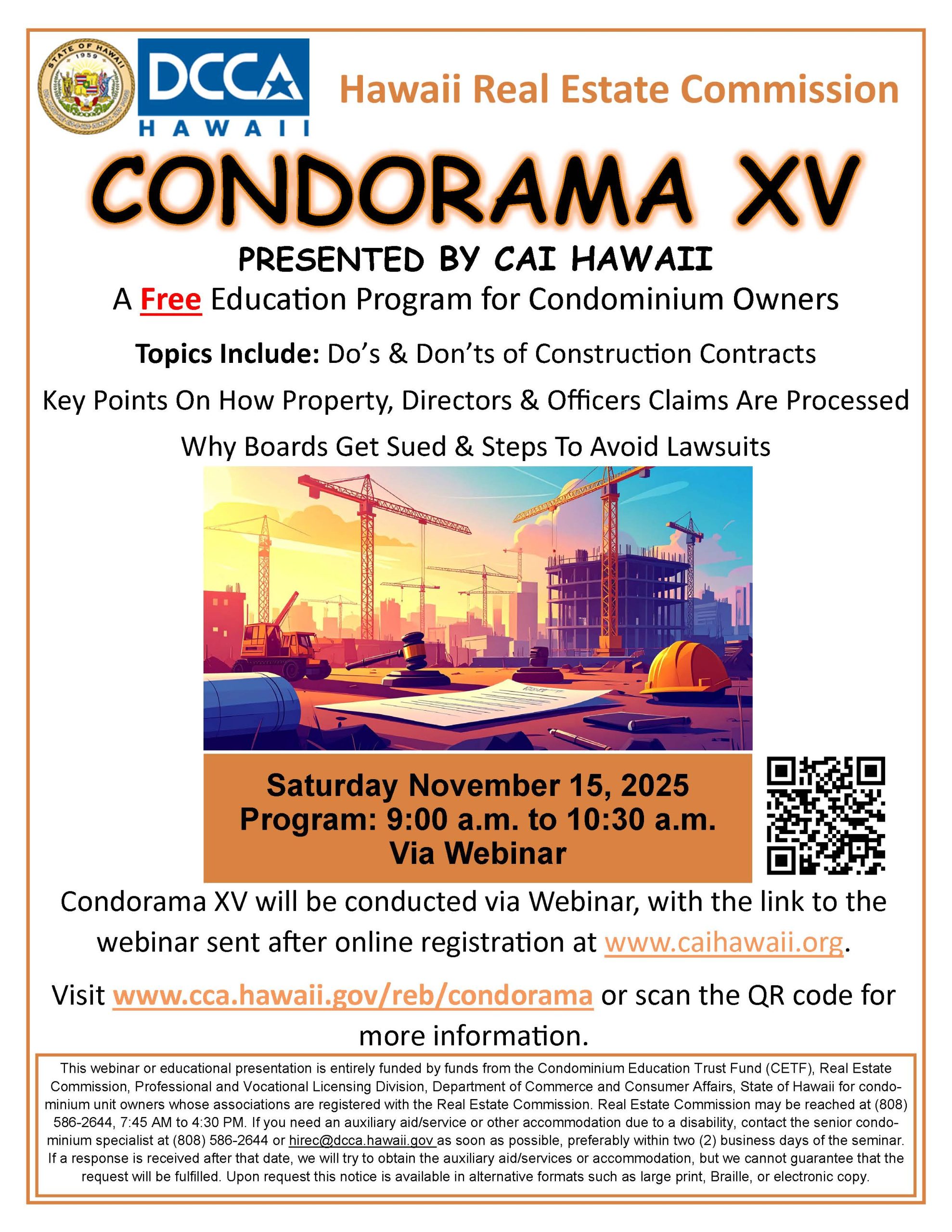 The recording of Condorama XV will be viewable on CAI’s website via a free registration after the event. Other Condorama seminars are posted to the the Hawaii Real Estate Commission’s Youtube Channel or on CAI Hawaii’s website.